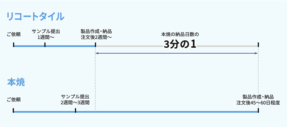 弊社オリジナル製品「リコートタイル」は、最短2週間での納品が可能です。急な生産のご依頼もお気軽にご相談ください。