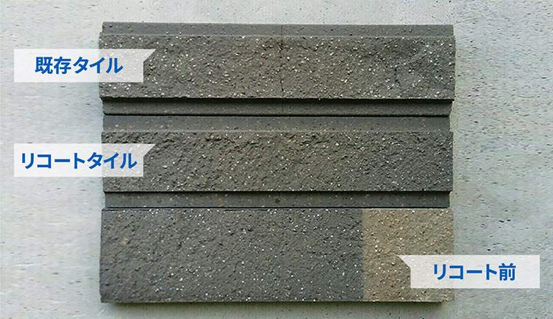 リコートタイルは、短納期に特化した弊社オリジナル商品です。選定した近似タイルに、自社調合の低温釉薬や有機・無機塗材を塗布して低温で再焼成することで、色や風合いを既存タイルへ近づけるように補正します。また、作業は職人が1枚ずつ手作業で行うため、短納期ながらも精度の高い復元タイルを実現しています。